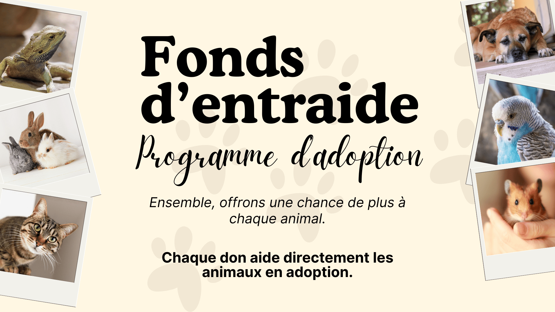 Chaque contribution versée au Fonds d'entraide – Programme d'adoption aide directement les animaux pris en charge par les Centres d'animaux Nature : soins vétérinaires, examens, chirurgies, médicaments, nourriture, litière, transport et plus encore.